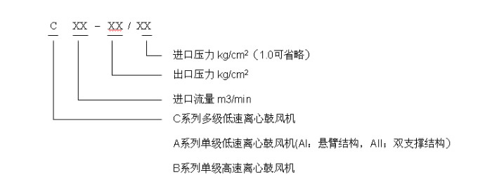 例如: C300–1.7/1.0 表示在温度20℃,进口压力1.0kgf/cm2(98kPa)相对湿度50%的进气条件下,进口流量为300 m3/min,出口压力1.7kgf/cm2(升压68.6kPa)的多级离心鼓风机。