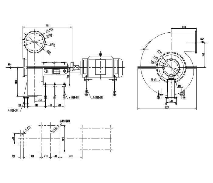 ● 单级低速离心鼓风机外形尺寸 AI600-800单级低速离心鼓风机安装示意图 (仅供参考,施工以合同设计图为准)