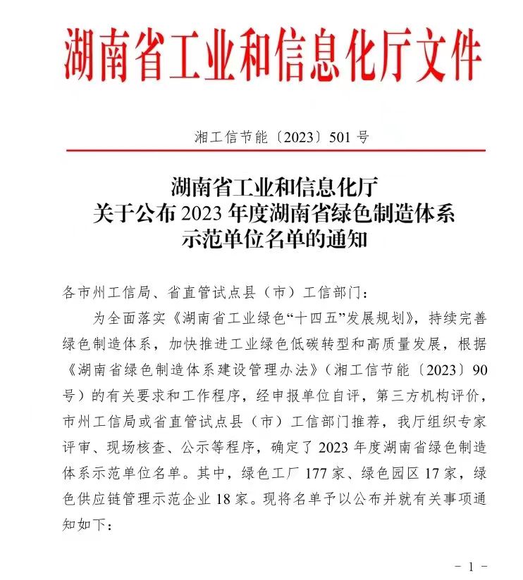 绿色制造评选旨在贯彻落实《中国制造2025》、《湖南省工业绿色“十四五”发展规划》,持续完善绿色制造体系,加快推进工业绿色低碳转型和高质量发展,获得这项殊荣,是对工业制造业工厂绿色发展的肯定。